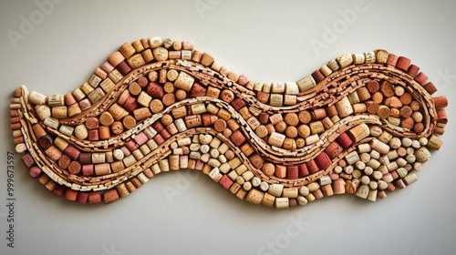 wine, cork, wall, art, wave, creative, modern, abstract, design, decorative, unique, texture, pattern, arrangement, hand-made, craft, artistic, display, interior, aesthetic, recycled, environmentally friendly, innovative, organic, natural, colours, brown, tan, beige, shape, curve, flowing, home, stylish, contemporary, bricolage, project, piece, lover, collection, detail, composition, background