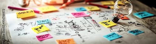 Creative workspace with colorful sticky notes and sketches, ideal for brainstorming and project planning.