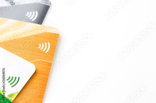 Credit cards with contactless payment. Pile of credit cards on white isolated background