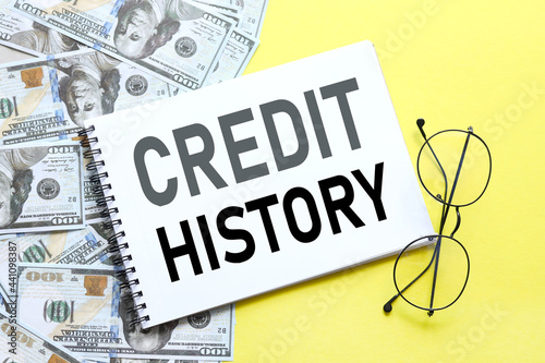 credit history. background with money, dollar bills and yellow background. text on notepad