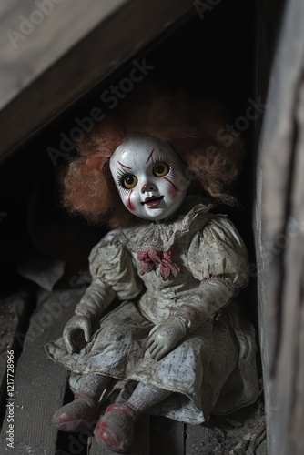Creepy clown doll attic hiding horror film prop
