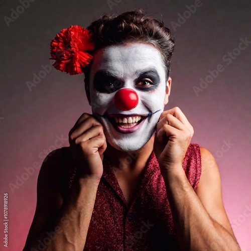 fun, red, white, background, isolated, celebration, happy, holiday, person, studio, party, young, people, joy, portrait, caucasian, smile, male, face, man, funny, expression, make-up, crazy, mask, costume, carnival, circus, clown