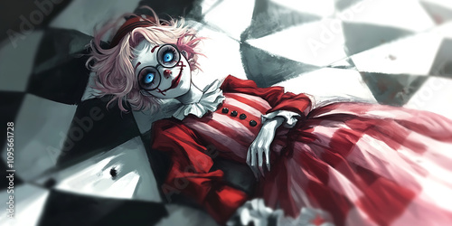 Creepy Cute Clown Girl: Digital painting of a unsettlingly adorable clown girl in a red and white dress, lying on a checkered floor. Her pale skin, bright blue eyes.