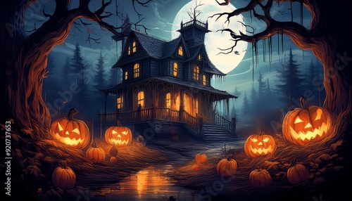 glow, pumpkin, moonlight, forest, three-dimensional, sorcerer, trick, graphic, concept, lettering, template, typography, banner, art, poster, bat, greeting, promotion, party, card, creepy, autumn, october, background, skittish, cartoon, horror, design, halloween, holiday, event, fall, house, mystery, moon, celebration, night, invitation, text, scarey, happy, illustration, black, decoration, vector, dark