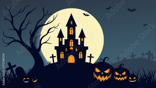 Creepy Haunted House Night Background with Bats and Pumpkins