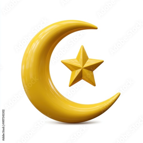 islam, moon, star, crescent, religious, symbol, faith, belief, muslim, ramadan, yellow, three-dimensional, rendering, design, illustration, graphic, holiday, festival, culture, art, image, icon, shape, object, shiny, gold, bright, light, element, white, background