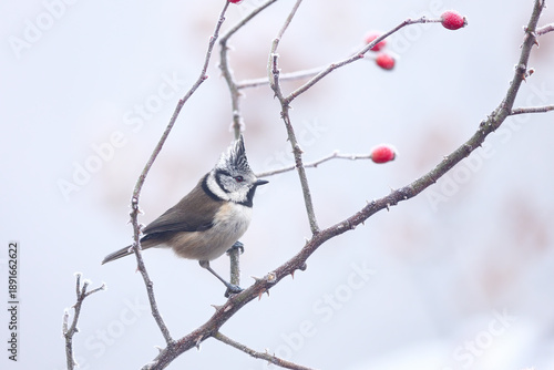 crested, tit, bird, winter, frost, tree branch, berry, nature, wildlife, fauna, environment, perch, forest, cold, chilly, serene, snow, season, wild, outdoors, animal, avian, plumage, habitat, tree, twig, natural, wilderness, scene, peaceful, quiet, beauty, detail, icy, landscape, background, vibrant, contrast, delicacy, red, photo, half face