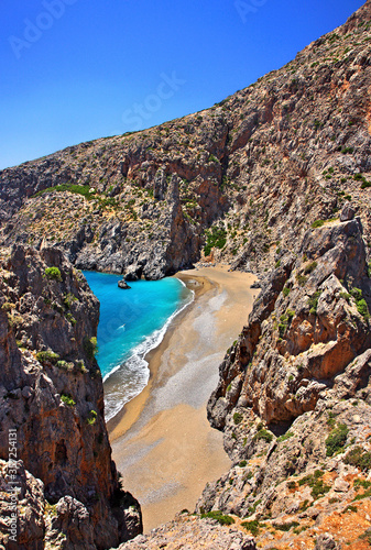 CRETE ISLAND, GREECE. Amazing beach at the exit of Agiofarago canyon, Municipality of Phaistos, Heraklion prefecture.