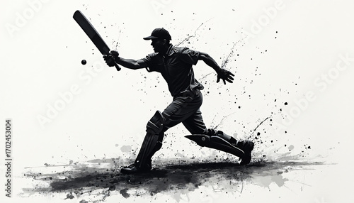 cricket, player, silhouette, bat, ball, action, sport, movement, dynamic, splash, splatter, ink, paint, black, white, grey, shadow, figure, athlete, game, stance, run, swing, strike, hit, sharpened, intensity, energy, motion, ground, dust, artistic, abstract, stylised, field, pitch, cap, uniform, aggressive, powerful, activewear, speed, moment