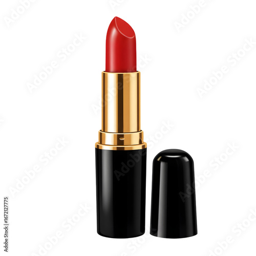Crimson Allure: A glamorous lipstick, with a bold red shade, presented in a stylish black and gold tube, symbolizing beauty and elegance.
