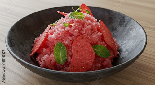 dessert, red, pink, fruit, sweet, cold, refreshing, bowl, food, culinary, epicure, garnish, mint, textured, delicious, confection, treat, summer, plate, culinary arts, presentation, taste, favor, texture