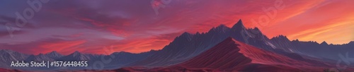 Crimson peaks pierce vibrant skies, alien flora blankets slopes , dramatic, range, peaks