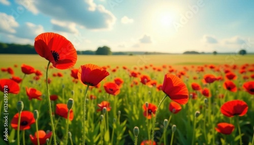 Crimson poppies sway gently in a vast field under a summer sun , poppy field, sun, serene