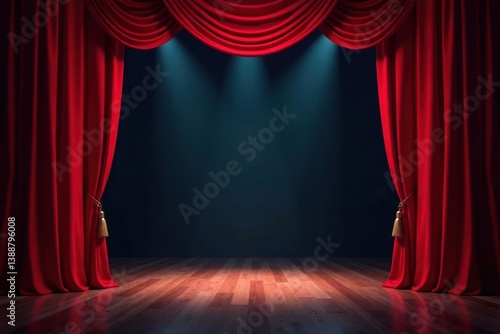 Crimson velvet curtains rise, revealing empty stage, stark spotlights , velvet, stage, curtain