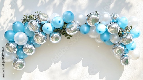 Crisp daylight scene of arch with silver and baby blue balloons, minimalist white background with clean props, strong sunlight with soft shadows, empty for stock use