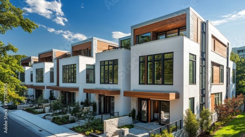 Crisp white townhouses with angular roofs and minimalist landscaping, surrounded by the city's urban energy.