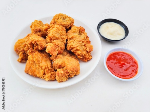 Crispy and crunchy fried chicken in a white plate and mayonnaise sauce in a small black bowl and chili sauce in a small white bowl on a white background.