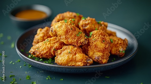 Crispy and golden fried chicken wings served on a stylish black plate with a side of dipping sauce, garnished with fresh herbs.