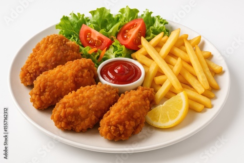 Crispy battered chicken served with golden fries, tangy ketchup, and fresh greens
