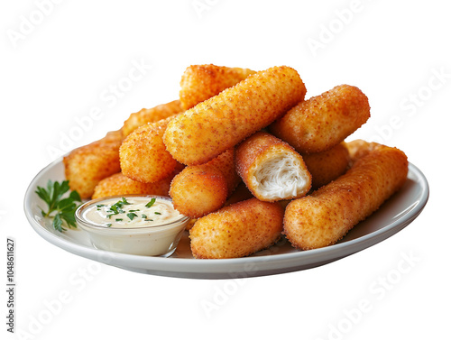 Crispy Breaded Cheese Sticks with Creamy Dipping Sauce on Transparent Background – Ideal for Snack Food Photography, Menus, and Recipe Blogs