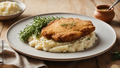 Crispy Breaded Chicken Cutlet Mashed Potatoes Rosemary Garnish Rustic Style