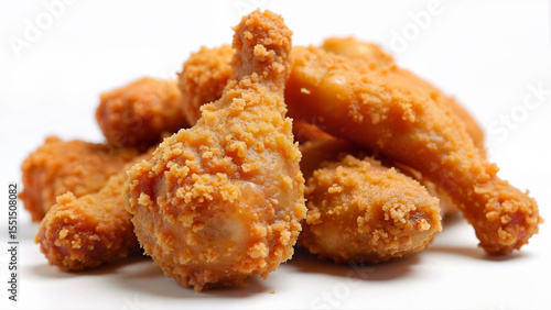 Crispy breaded fried chicken drumsticks are arranged on a white isolated background. The image is suitable for food advertising, menu design, or culinary blogs.