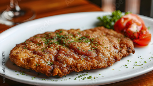 schnitzel, breaded, crispy, food, plate, parsley, tomatoes, salad, garnished, meat, main, dish, dinner, eatery, cookery, austrian, german, deep, fried, lunch, epicure, traditional, culinary, delicious, meal, wooden, table, fine, dining, herb, european