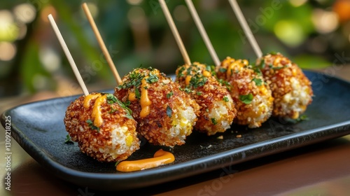 Crispy cheese bites on skewers with spicy sauce and herb garnish on black plate
