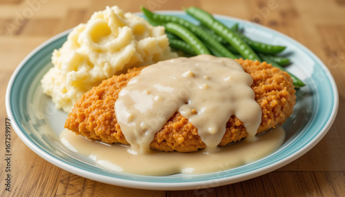 Crispy chicken fried steak with creamy gravy, mashed potatoes, and green beans