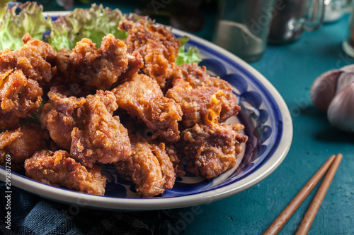 chicken, fried, japanese, dish, cookery, food, dinner, lunch, meal, meat, snack, brunch, drumstick, piece, crispy, spicey, delicious, chopstick, blue, background, nobody, plate, lemon, oriental, asian, gold, epicure, table, traditional, popular