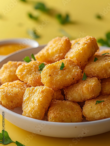 food, fried, crispy, gold, nugget, plate, dish, snack, breaded, delicious, tasty, junk food, fast food, unhealthy, yellow background, natural light, savoury, munchy, comfort food, finger food, meal