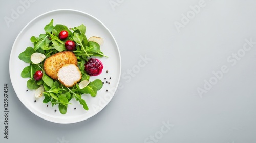 chicken, salad, greener, arugula, berry, cranberry, dish, meal, food, healthy, fresh, epicure, plate, dining, culinary, cooking, nourishment, colourful, protein, vegetarian, cookery, organic, presentation, topping, side dish, garden, eatery, kitchen, delicious, dietitian, nutrient, favor, taste, balanced, homemade, fork, modern, aesthetic, design, decorating