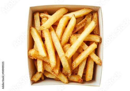 Crispy fresh fries in cardboard box. Transparent background .Isolated PNG