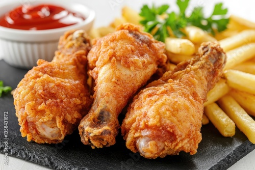 crispy fried chicken drumsticks, French fries, arranged casually around the drumsticks with red ketchup.
