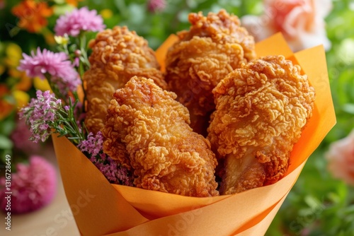 Crispy fried chicken drumsticks in orange paper bouquet with flowers