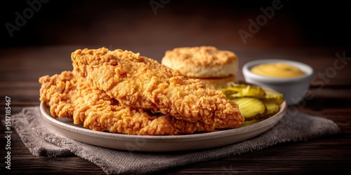 Crispy fried chicken fillets served with dill pickles and buttermilk biscuit accompanied by spicy mustard sauce creating a mouthwatering southern comfort food experience