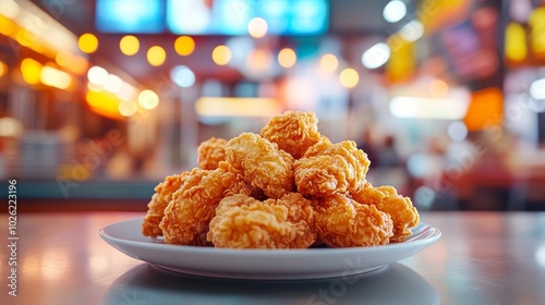 plate, white, chicken, fried, crispy, nugget, food, dish, snack, dinner, lunch, meal, tasty, delicious, crunchy, gold, brown, fast, eatery, bar, cafes, take-away, greasy, unhealthy, fat, junk, junk food, salty, savoury, eat, eating, bite, breaded, battered, batter, flaky, favor, oil, grease, texture, contrast, background, light, blurry, table, surface