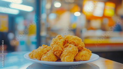 chicken, nugget, fried, crispy, plate, white, food, meal, snack, dinner, lunch, fast, greasy, tasty, delicious, gold, brown, crunchy, savoury, fat, unhealthy, eatery, junk, take-away, take-out, fresh, hot, table, surface, blurry, background, light, bright, indoor, overhead