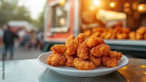 food, chicken, nugget, fried, crispy, plate, white, meal, fast, snack, lunch, dinner, tasty, delicious, savoury, crunchy, gold, brown, breaded, batter, grease, oil, eatery, take-away, street, seller, outdoors, bright, warm, light, table, blur, background, people, crowd, tied-up