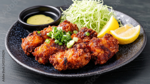 Crispy fried chicken served with fresh cabbage, lemon, and dipping sauce creates delightful meal
