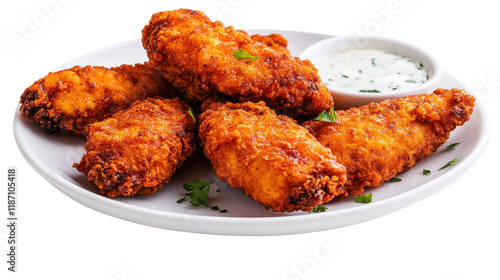 Crispy fried chicken wings served with creamy dipping sauce. transparent background