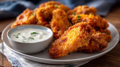 Crispy Fried Chicken Wings with Creamy Dip on a Plate