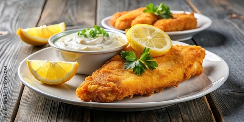 Crispy fried fish fillet on a plate with tartar sauce and lemon wedge