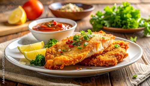 fish, fried, crispy, breaded, dinner, plate, sauce, tomatoes, lemon, herb, parsley, wooden, table, food, dish, healthy, eatery, appetising, delicious, meal, seafood, closeup, grilled, seasoning, spicey, gold