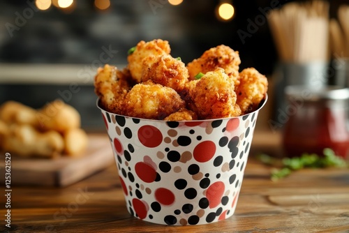 Crispy Fried Potato Bites in a Colorful Polka Dot Container on a Rustic Wooden Table
