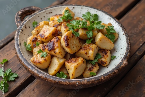 dumpling, food, cookery, side dish, comfort food, parsley, dinner, meal, food photography, wooden table, potato, yeast, vegetarian, health food, crispy, golden brown, baked, seasoned, rustic