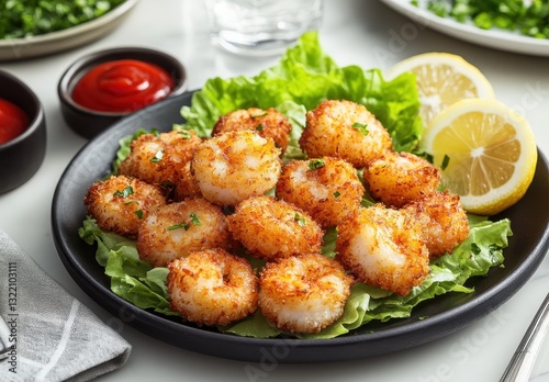 shrimp, seafood, fried food, crispy, lettuce, lemon, platter, meal, delicious, cooking, epicure, dining, freshness, cookery, food photography, vibrant, receipe, eatery, kitchen, tasty, herb, favor, presentation, party, gathering, summer, lunch, dinner, casual attire, enjoyment, plate, culture, homemade, entertaining, condiment, sauce, light meal, healthy, alimentary, snack, culinary arts, texture, home cooking