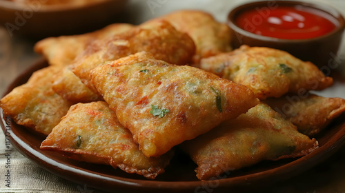 Crispy Fried Snacks with Red Sauce: Close-up of a Plate of Golden Brown Appetizers