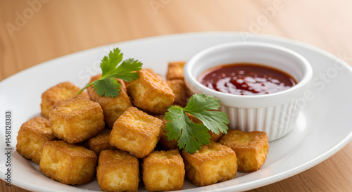 Crispy Fried Tofu Cubes with Red Sauce and Parsley Garnish on White Plate with Golden Brown Tones on Neutral Background