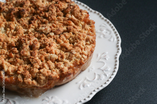Crispy gluten free apple pie on a beautiful white plate with decoration on a dark table. Close up. Pie, apple, white plate. Autumn concept.